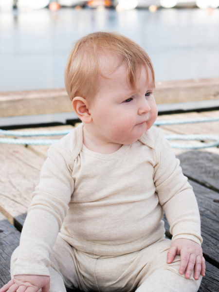 To provide maximum comfort, melange babywear can be combined with wool garments. Wool has natural temperature-regulating qualities and is a great complement during the colder months. It helps keep your baby warm and dry by absorbing moisture without feeling damp or chilly.