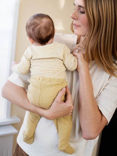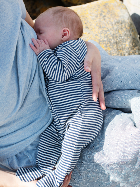 All items in our newborn melange collection are made from GOTS-certified organic cotton. This material is chosen for its softness, breathability, and gentle feel on sensitive baby skin. The colours are muted and softly mottled, giving a calm look that makes mixing and matching simple. Our production process is free from harmful chemicals and thoughtfully designed to care for both baby and planet. You can read more about our approach to organic babywear here.